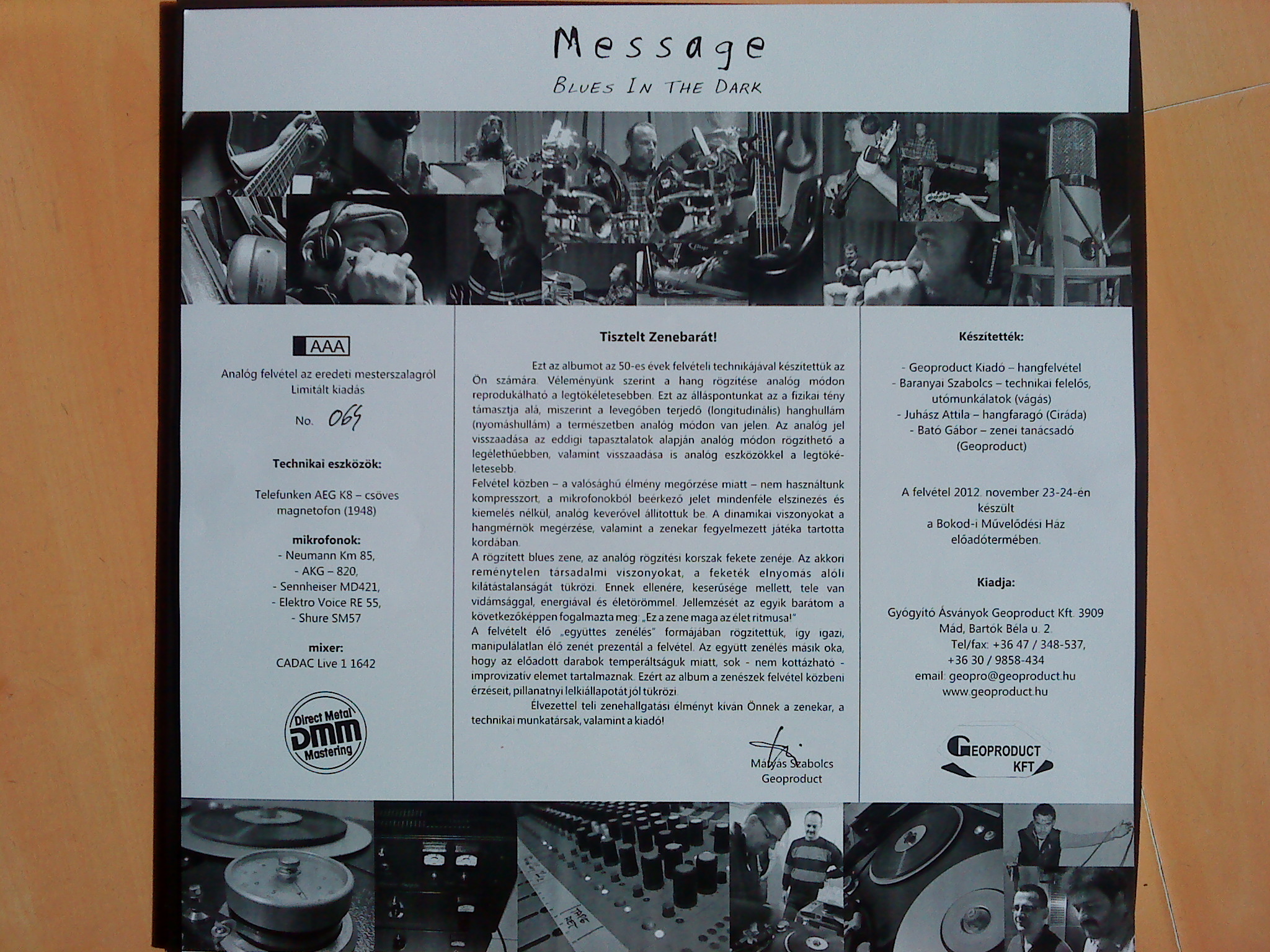 Felvétel közben - a valósághű élmény megőrzése miatt - nem használtunk kompresszort, a mikrofonokból beérkező jelet mindenféle elszínezés és kiemelés nélkül , analóg keverővel állítottuk be.